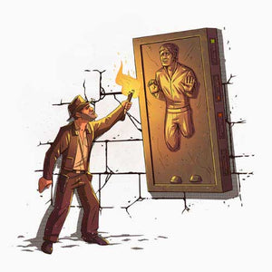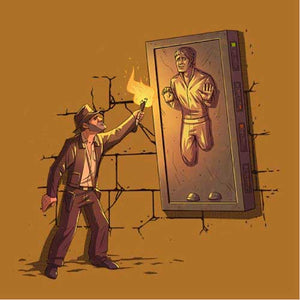 Indiana Carbonite, ou l’un de nos t-shirts crossover ultimes pour les cinéphiles ! S’il est rapidement sorti du lot dans American Graffiti de George Lucas, Harrison Ford est entré dans la légende en tournant ensuite dans deux des sagas les plus vénérées par les geeks, Indiana Jones et Star Wars. De quoi remplir en lettres d’or son CV pour l’éternité ! Le contrebandier Han Solo et l’explorateur Indiana Jones sont deux personnages cultes et mémorables, qu’on n’a pas pu résister à rassembler sur un seul et même modèle, dans lequel Indy fait une bien étrange découverte… Un tee-shirt aussi drôle qu’original, et un bel hommage au cinéma.