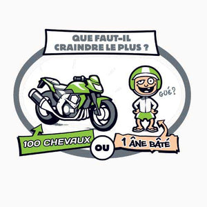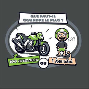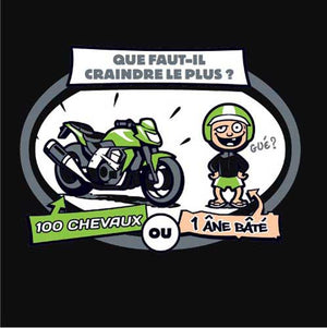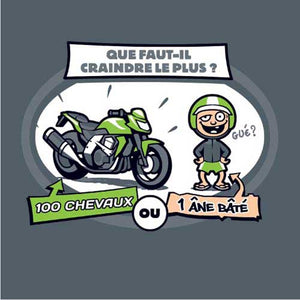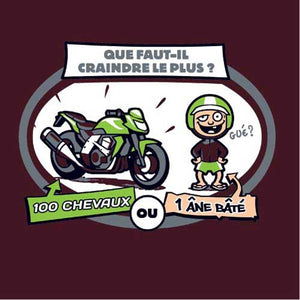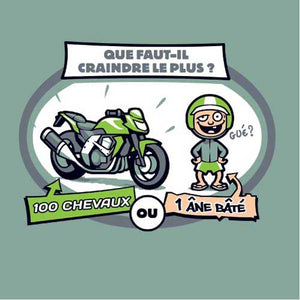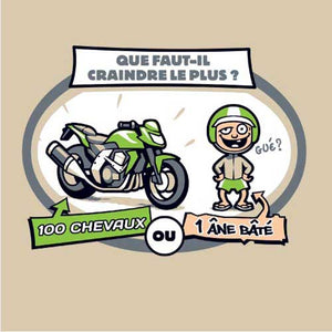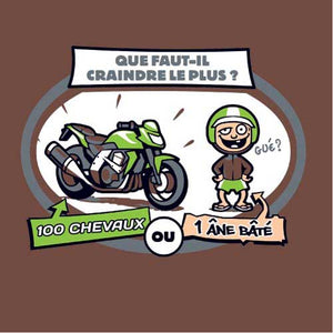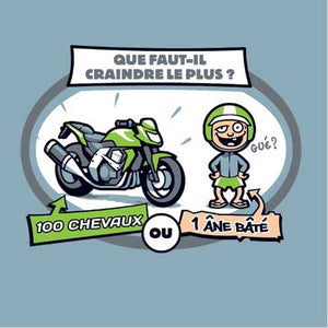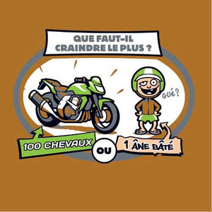 Voilà une devinette bourrée d’humour, à laquelle vous n’aurez probablement aucun mal à répondre. Que faut-il craindre le plus, à votre avis ? 100 chevaux ou un âne bâté ? L’âne bâté, évidemment ! Les 100 chevaux, on prend les yeux fermés ! Par contre l'âne bâté en short, tong et casque bol, on préfère éviter ! Des kékés comme ça, on en voit malheureusement encore trop souvent... A porter sans modération pour rappeler l’évidence !