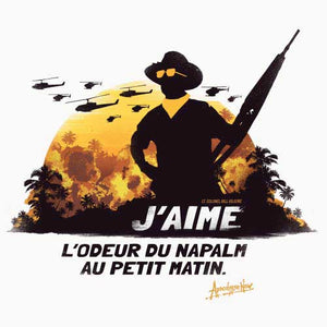 Considéré comme un des plus grands films de tous les temps, Apocalypse Now de Francis Ford Coppola est aussi célèbre pour ses qualités que pour son tournage maudit. Personnage inoubliable, le colonel Bill Kilgore incarne parfaitement la folie qui peut s'emparer des hommes en temps de guerre. On a choisi de représenter sa réplique culte sur un tee-shirt très graphique, pour arborer avec classe ce monument du cinéma !