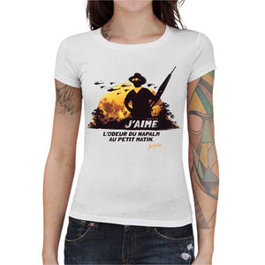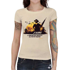 Considéré comme un des plus grands films de tous les temps, Apocalypse Now de Francis Ford Coppola est aussi célèbre pour ses qualités que pour son tournage maudit. Personnage inoubliable, le colonel Bill Kilgore incarne parfaitement la folie qui peut s'emparer des hommes en temps de guerre. On a choisi de représenter sa réplique culte sur un tee-shirt très graphique, pour arborer avec classe ce monument du cinéma !