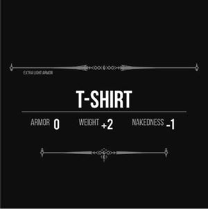 Le tee-shirt est une pièce d’équipement indispensable de tout bon geek pour affronter le péril de l’extérieur et du quotidien. Checkpoint vous a donc concocté le modèle rêvé, qui fera grimper vos stats: -1 en nudité, et +2 en légèreté, histoire de vous mouvoir sans problème. Un bel hommage à l’interface des RPG, et plus précisément à celle de la cultissime saga The Elder Scrolls !