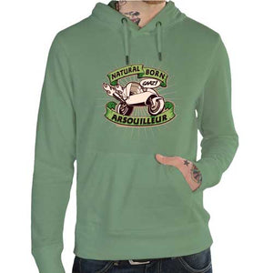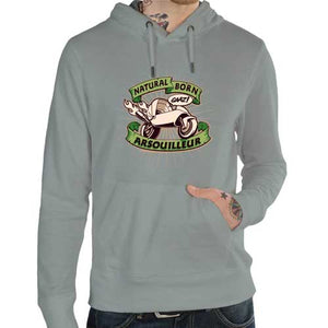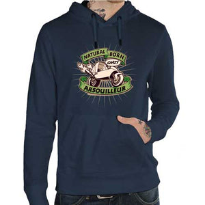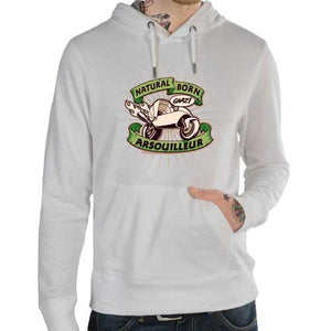 Les premières fraicheurs arrivent, et vous n’êtes plus sûr que votre tee-shirt va suffire ? Pas de panique ! Ce Sweat Moto - Arsouilleur-né va tout simplement vous sauver la vie !