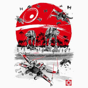 La bataille de Scarif reste un moment inoubliable du film Rogue One. Théâtre de la mission commando de Jyn Erso et des rebelles pour voler les plans de l’S de la Mort, la planète aux plages paradisiaques ne pouvait pas trouver meilleur hommage que ce tee-shirt dantesque et fourmillant de détails. Un superbe tee-shirt Star Wars !