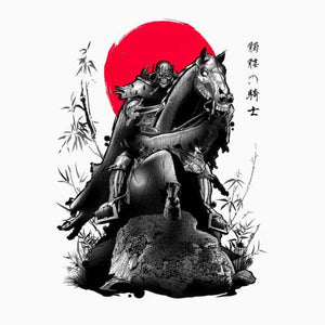 Les fans de Berserk auront certainement reconnu au premier coup d'œil le chevalier de ce magnifique tee-shirt. Il faut dire que le Skullknight est un des personnages les plus fascinants du légendaire manga de Kentarō Miura ! Très impressionnant avec son masque et son armure squelette, doté d’une puissance et de pouvoirs phénoménaux, il est en outre très mystérieux sur son identité et ses motivations. Le voici représenté sur ce tshirt dans toute sa splendeur, prêt à jaillir, avec un soleil rouge évoquant le passage ô combien traumatisant de l’Eclipse.