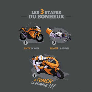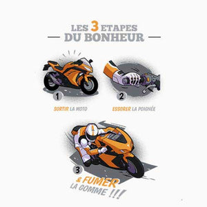 Là où certains passeront toute leur vie à chercher la recette du bonheur, le motard, lui, la connaît pas cœur ! Et elle est simplissime, puisqu’il n’y a que trois étapes basiques, que Checkpoint vous rappelle ici avec style. En ce qui nous concerne, on est d’ailleurs passé depuis longtemps à la troisième étape... Alors, envie de goûter au bonheur vous aussi ? Vous savez quoi faire ! Un tee-shirt plein d’humour pour tous les amoureux des deux roues.