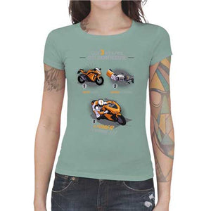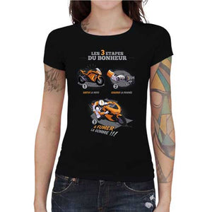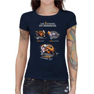 Là où certains passeront toute leur vie à chercher la recette du bonheur, le motard, lui, la connaît pas cœur ! Et elle est simplissime, puisqu’il n’y a que trois étapes basiques, que Checkpoint vous rappelle ici avec style. En ce qui nous concerne, on est d’ailleurs passé depuis longtemps à la troisième étape... Alors, envie de goûter au bonheur vous aussi ? Vous savez quoi faire ! Un tee-shirt plein d’humour pour tous les amoureux des deux roues.