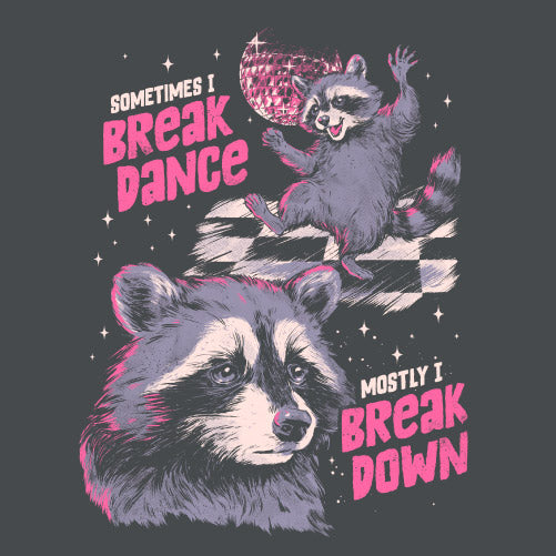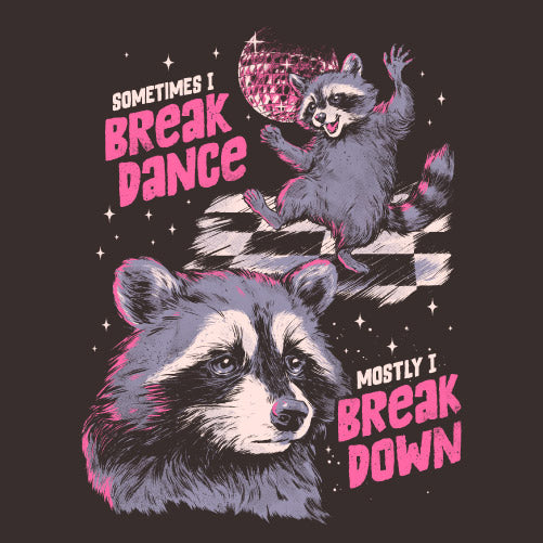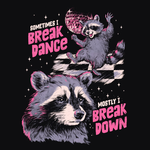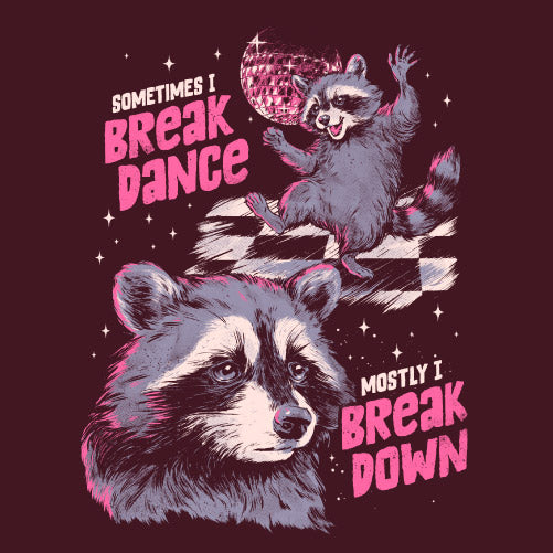 Break Danse ! met en scène un raton laveur partagé entre deux états opposés : parfois en pleine énergie, dansant avec style, et parfois submergé par un moment de fatigue ou de mélancolie. L’illustration joue avec le contraste entre le break dance et le break down, transformant ces émotions en une scène drôle et touchante. À travers ce personnage attachant, le visuel évoque un sentiment universel : ces hauts et ces bas que chacun peut ressentir au quotidien. Entre humour, tendresse ce design capture avec finesse l’équilibre fragile entre euphorie et vulnérabilité, offrant une illustration à la fois expressive et profondément humaine.