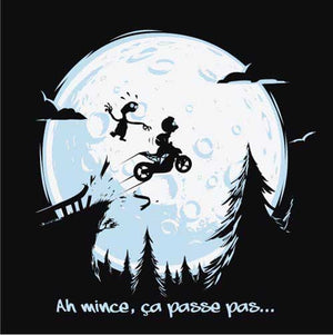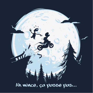 Tous les motards le savent, mieux vaut assurer son freinage lorsqu’on aborde un virage délicat… Lui, on peut dire qu’il a attaqué la courbe avec un peu trop de confiance ! Normal, lorsqu’on transporte E.T. et qu’on est persuadé que le gentil extraterrestre va rattraper le coup… Sauf qu’à cette vitesse, c’est tout de suite moins évident qu’à vélo ! Une référence pleine d’humour à un classique du septième art, pour un tee-shirt tout simplement indispensable !