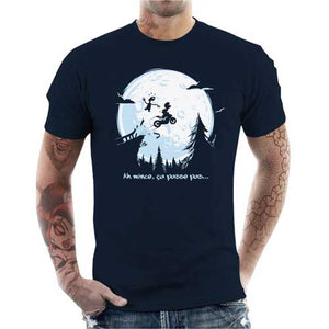 Tous les motards le savent, mieux vaut assurer son freinage lorsqu’on aborde un virage délicat… Lui, on peut dire qu’il a attaqué la courbe avec un peu trop de confiance ! Normal, lorsqu’on transporte E.T. et qu’on est persuadé que le gentil extraterrestre va rattraper le coup… Sauf qu’à cette vitesse, c’est tout de suite moins évident qu’à vélo ! Une référence pleine d’humour à un classique du septième art, pour un tee-shirt tout simplement indispensable !