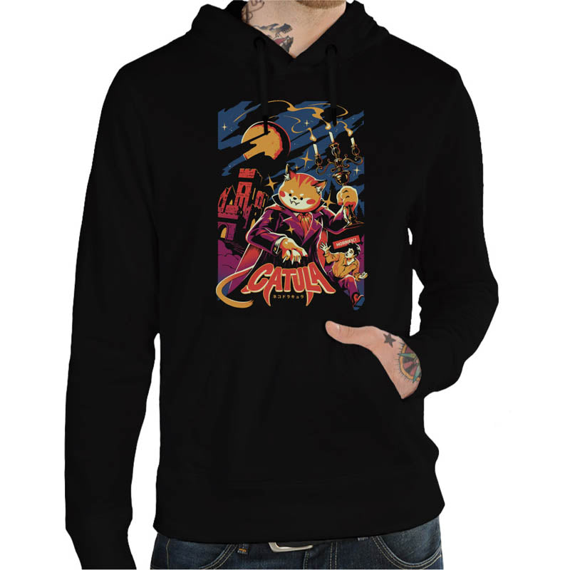 Catula revisite avec humour l’icône du comte Dracula en le remplaçant par un chat aristocratique à l’allure sinistre. Drapé dans une cape gothique, il se tient devant son château baigné par la lueur froide de la lune, un chandelier à la patte tandis que ses griffes laissent deviner une soif peu recommandable. Entre horreur classique et second degré félin, l’illustration joue sur le contraste entre la noblesse du vampire et la malice naturelle du chat. Un design sombre, élégant et décalé qui séduira les amateurs de culture gothique, de films d’horreur vintage et d’humour noir stylisé.