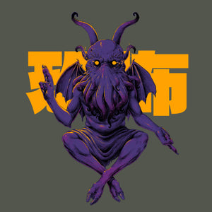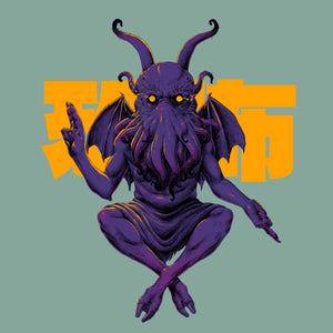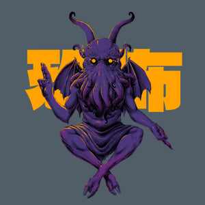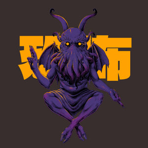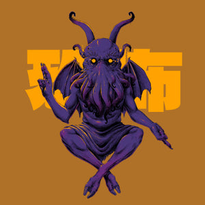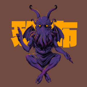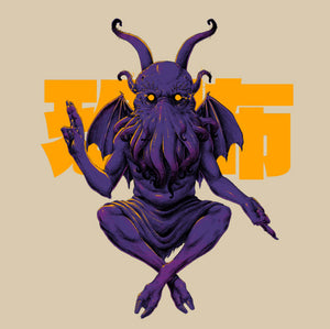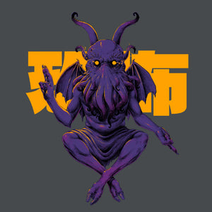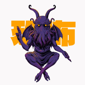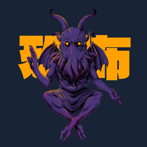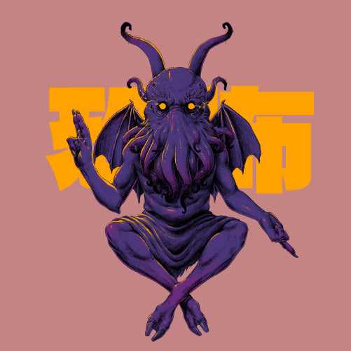 Le t-shirt "Deity" revisite l’icône mythique de l’horreur cosmique dans une version étonnamment paisible. La créature légendaire de Lovecraft, symbole de folie et de terreur, est ici représentée en lévitation méditative, dans une posture zen. Derrière elle, le mot “Horreur” est inscrit en japonais. Le graphiste joue avec un contraste saisissant : des teintes pop jaune et violette pour lui donner une allure presque psychédélique. Un design à la croisée de la peur et de la sérénité, pour les amateurs de dark humour et d’esthétique occulte.