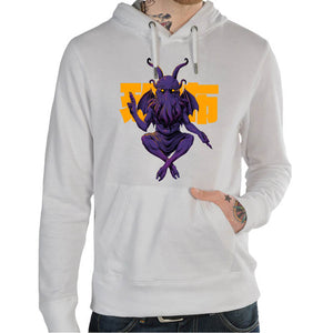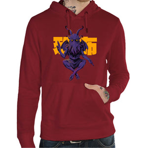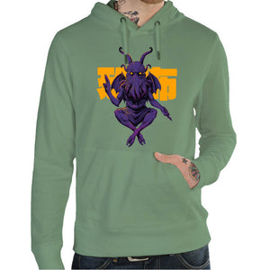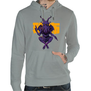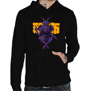 Le t-shirt "Deity" revisite l’icône mythique de l’horreur cosmique dans une version étonnamment paisible. La créature légendaire de Lovecraft, symbole de folie et de terreur, est ici représentée en lévitation méditative, dans une posture zen. Derrière elle, le mot “Horreur” est inscrit en japonais. Le graphiste joue avec un contraste saisissant : des teintes pop jaune et violette pour lui donner une allure presque psychédélique. Un design à la croisée de la peur et de la sérénité, pour les amateurs de dark humour et d’esthétique occulte.