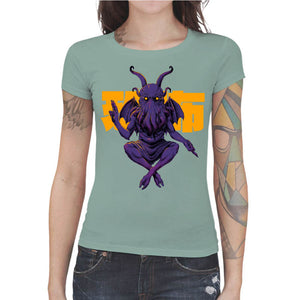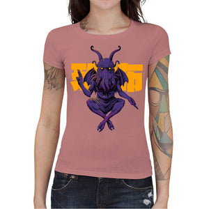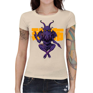 Le t-shirt "Deity" revisite l’icône mythique de l’horreur cosmique dans une version étonnamment paisible. La créature légendaire de Lovecraft, symbole de folie et de terreur, est ici représentée en lévitation méditative, dans une posture zen. Derrière elle, le mot “Horreur” est inscrit en japonais. Le graphiste joue avec un contraste saisissant : des teintes pop jaune et violette pour lui donner une allure presque psychédélique. Un design à la croisée de la peur et de la sérénité, pour les amateurs de dark humour et d’esthétique occulte.
