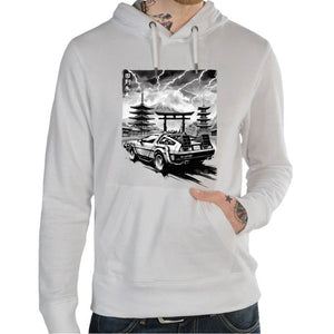 Ce t-shirt épique combine l'univers de la science-fiction avec le Japon féodal. La célèbre DeLorean, voiture emblématique des voyages dans le temps, est projetée dans un décor historique, avec le majestueux Mont Fuji en arrière-plan. Les éclairs qui frappent la montagne ajoutent une énergie spectaculaire à l'illustration en noir et blanc, capturant l'intensité du voyage temporel. Ce design offre un contraste saisissant entre l'esthétique rétro-futuriste de la DeLorean et la beauté traditionnelle du Japon ancien. Parfait pour les fans de science-fiction et de culture japonaise qui aiment porter un t-shirt original et dynamique.