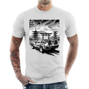 Ce t-shirt épique combine l'univers de la science-fiction avec le Japon féodal. La célèbre DeLorean, voiture emblématique des voyages dans le temps, est projetée dans un décor historique, avec le majestueux Mont Fuji en arrière-plan. Les éclairs qui frappent la montagne ajoutent une énergie spectaculaire à l'illustration en noir et blanc, capturant l'intensité du voyage temporel. Ce design offre un contraste saisissant entre l'esthétique rétro-futuriste de la DeLorean et la beauté traditionnelle du Japon ancien. Parfait pour les fans de science-fiction et de culture japonaise qui aiment porter un t-shirt original et dynamique.
