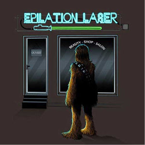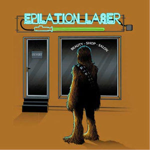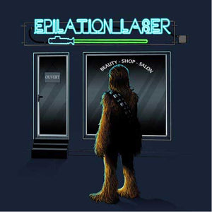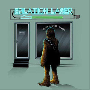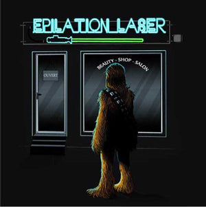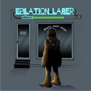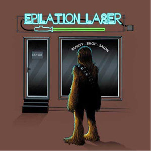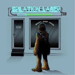 Envie d’un t-shirt Star Wars humoristique au poil ? Est-ce une demande de Han Solo, lassé de ramasser le pelage de son partenaire dans le Faucon Millenium ? Ou bien une soudaine envie du très velu contrebandier de changer de look ? Le fait est qu’un bon toilettage s’impose pour Chewbacca… Mais Star Wars oblige, ce n’est pas une épilation à la cire qui attend le pauvre wookie, une au laser ! Espérons que ce soit un Jedi de talent qui s’en occupe, sans quoi l’affaire pourrait très mal tourner… Un tee-shirt SW plein d’humour, qui s’avérera encore plus drôle à porter pour les plus poilus d’entre vous !