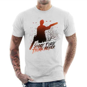 Mêlant une réalisation habile, une bonne dose d’hémoglobine et de l’humour bien foufou, la trilogie Evil Dead de Sam Raimi est considérée comme une incontournable du cinéma d’horreur américain. Au point de renaître dans les années 2010 sous la forme d’une série, absolument culte elle aussi ! L’occasion pour nous de rendre hommage à Ash à travers ce t-shirt plein de bon sens. Face aux démons, il vaut mieux ne pas trop réfléchir !