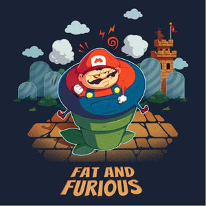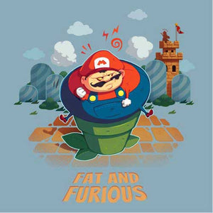 À force de se gaver de champignons pour traverser les nombreux niveaux de ses aventures, Mario a fini par prendre un peu d’embonpoint... Le pauvre ne rentre même plus dans les tuyaux, alors la Princesse Peach va devoir prendre son mal en patience pour être délivrée ! Vous aurez bien sûr reconnu le jeu de mots avec la saga mythique Fast and Furious. Un tee-shirt gamer bourré d’humour !