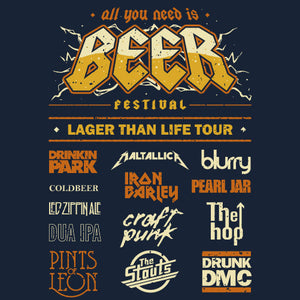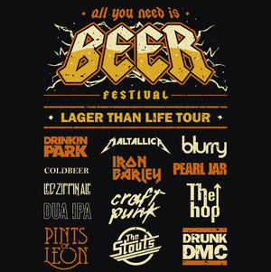 Bienvenue au Festival de la Bière, l’événement fictif où la mousse remplace les décibels ! Cette illustration façon affiche de festival met en scène une programmation délirante : les plus grands groupes de rock et de métal sont détournés avec humour pour devenir des hommages houblonnés. Un design fun et décalé qui séduira à la fois les amateurs de musique live et les passionnés de bonne bière artisanale. Parfait pour les soirées concerts, les afterworks ou les festivals d’été, ce t-shirt devient l’allié idéal des bons vivants et des fans de parodies.