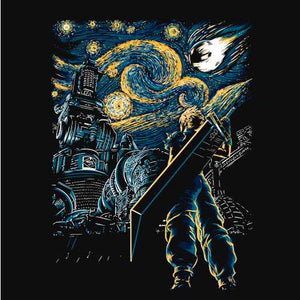Chez Checkpoint, on sait que vous êtes très nombreux à adorer Final Fantasy VII, considéré comme un des meilleurs épisodes de la saga (avec le VI !). On a ainsi souhaité vous proposer un tee-shirt original et très artistique, représentant Cloud Strife et son épée monumentale, dans un style qui rend hommage à la peinture Nuit étoilée de Vincent Van Gogh