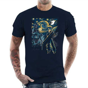 Chez Checkpoint, on sait que vous êtes très nombreux à adorer Final Fantasy VII, considéré comme un des meilleurs épisodes de la saga (avec le VI !). On a ainsi souhaité vous proposer un tee-shirt original et très artistique, représentant Cloud Strife et son épée monumentale, dans un style qui rend hommage à la peinture Nuit étoilée de Vincent Van Gogh !
