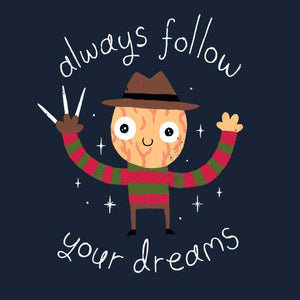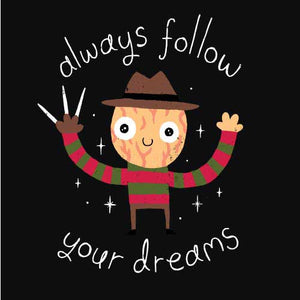 Est-ce que vous aviez déjà vu Freddy aussi mignon ? Certainement que non ! Tout l’intérêt vient justement du grand décalage entre le terrible et effrayant personnage qu’est Freddy Krueger dans ses films, et sa représentation tellement mimi sur ce t-shirt ! Pour un peu, on aurait presque envie de lui faire un câlin… On notera l’hilarant message Follow your dreams qui, comme les aficionados des films d’horreur le savent, est justement le pire danger qui guette les potentielles victimes du tueur en série… Un tee-shirt ultra kawaii et décalé, que vous allez adorer porter !