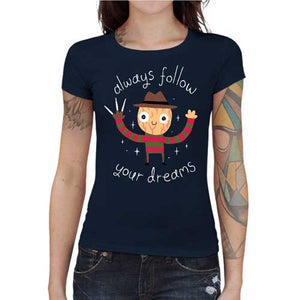 Est-ce que vous aviez déjà vu Freddy aussi mignon ? Certainement que non ! Tout l’intérêt vient justement du grand décalage entre le terrible et effrayant personnage qu’est Freddy Krueger dans ses films, et sa représentation tellement mimi sur ce t-shirt ! Pour un peu, on aurait presque envie de lui faire un câlin… On notera l’hilarant message Follow your dreams qui, comme les aficionados des films d’horreur le savent, est justement le pire danger qui guette les potentielles victimes du tueur en série… Un tee-shirt ultra kawaii et décalé, que vous allez adorer porter !