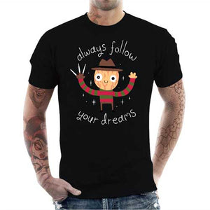 Est-ce que vous aviez déjà vu Freddy aussi mignon ? Certainement que non ! Tout l’intérêt vient justement du grand décalage entre le terrible et effrayant personnage qu’est Freddy Krueger dans ses films, et sa représentation tellement mimi sur ce t-shirt ! Pour un peu, on aurait presque envie de lui faire un câlin… On notera l’hilarant message Follow your dreams qui, comme les aficionados des films d’horreur le savent, est justement le pire danger qui guette les potentielles victimes du tueur en série… Un tee-shirt ultra kawaii et décalé, que vous allez adorer porter !