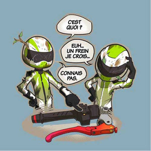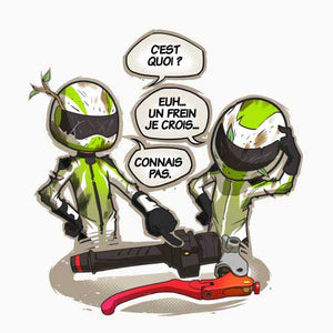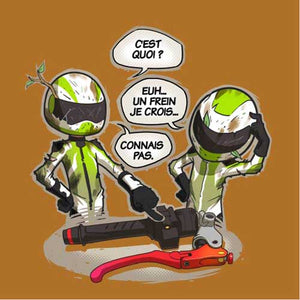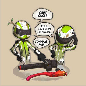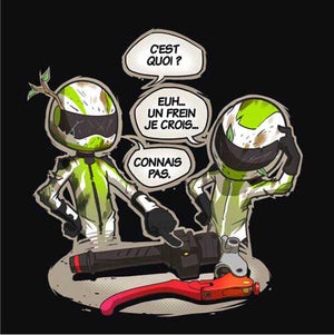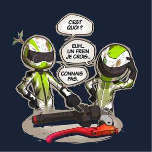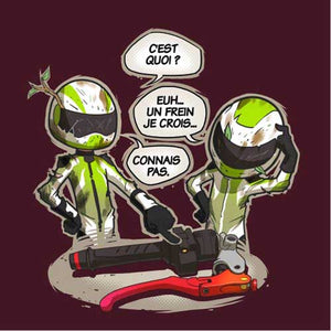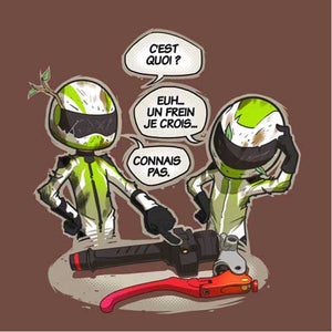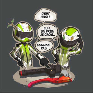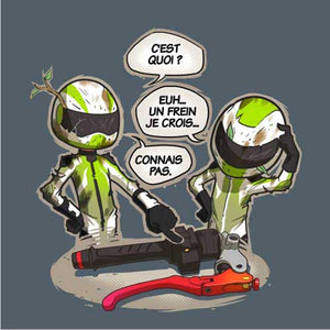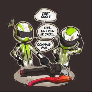 Mais qu’est-ce que c’est que cet étrange levier ? Un frein ? Curieux… Et à quoi ça sert, au juste ? À freiner ?? Désolé, jamais entendu parler… L’un des tee-shirts ultimes de la collection Checkpoint pour motards ! Stylé, bourré de détails, et drôle à souhait, c’est un modèle idéal pour tous les passionnés de deux roues, et bien sûr les accros à la vitesse, qui n’usent du frein que lorsque c’est absolument nécessaire. Parce que freiner, c’est tellement surfait.