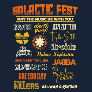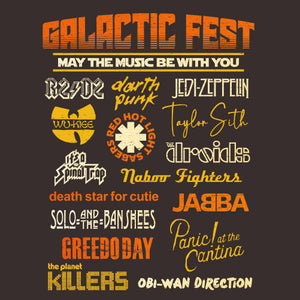 Le t-shirt "Galactic Fest" vous transporte dans un festival de musique venu d’une autre galaxie ! Cette illustration reprend le style des affiches de festivals mythiques, mais revisité avec humour dans l’univers de Star Wars. On y retrouve une liste de groupes emblématiques détournés : JABBA pour ABBA, Wu-Kiee pour le Wu-Tang Clan, ou encore The Droids pour The Doors. Le design regorge de clins d’œil musicaux et galactiques, parfait pour les fans de pop culture. À vous de découvrir les autres références cachées ! Un t-shirt collector pour Jedi mélomanes et rockeurs interstellaires.