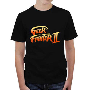 Votre enfant a déjà bien grandi, et vous souhaitez continuer sa formation de jedi geek ? Pas besoin de risquer de le blesser avec un sabre laser, on a beaucoup mieux pour lui: ce T-shirt enfant geek - Geek Fighter II !