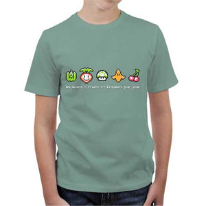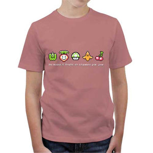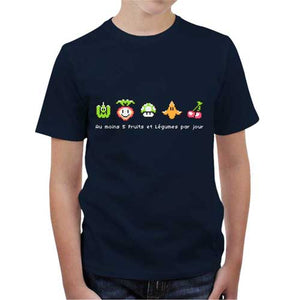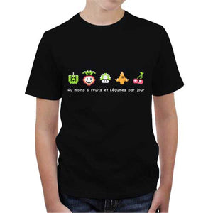 Nous, les geeks, on tourne à cinq fruits et légumes par jour au minimum, comme l’atteste bien ce t-shirt Mario ! Des cerises, champignons et radis qu’on va ingurgiter pour gagner une vie, avoir des capacités spéciales, ou bien qu’on va envoyer à la face des Koopas, Bob-ombs, et autres Maskass. Même les bananes sont primordiales, histoire de faire déraper nos adversaires sur Mario Kart dans la dernière ligne droite ! Un tee-shirt qui sent bon les pixels et le rétrogaming, pour montrer avec humour que vous aussi, vous savez manger sainement… Du moins, sur votre console !