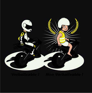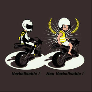 Ah, ce beau gilet jaune qu'on nous impose de porter pour notre sécurité ! Au lieu, par exemple, de rendre obligatoire les combinaisons en cuir... Et évidemment, ce sont les gendarmes motards, en chemisette, qui vous adresseront la contravention. Si ça a le don de vous agacer, alors vous allez adorer ce tee-shirt humoristique un brin subversif, qui montrera que vous au moins, vous avez du style. Pour les motards, les vrais !