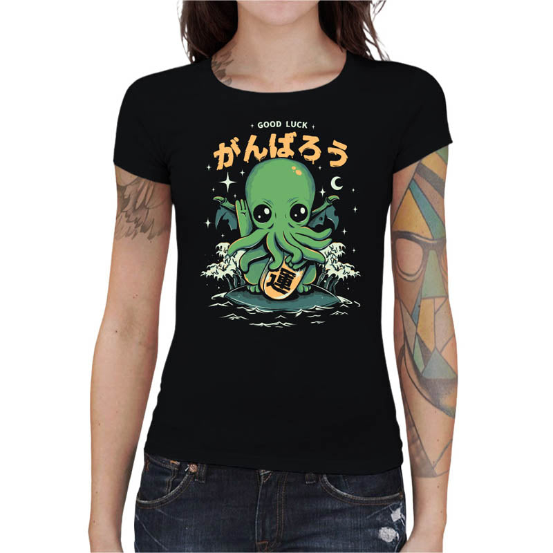 Good Luck Cthulhu détourne avec malice l’horreur cosmique pour lui donner une touche kawaii irrésistible. Le redoutable Cthulhu se transforme ici en créature adorable et bienveillante, portant autour du cou une amulette de chance ornée de l’idéogramme japonais signifiant « chance ». Dans son dos, une imposante vague inspirée du style de Kanagawa apporte contraste et puissance visuelle, mêlant tradition japonaise et culture pop. Entre mythologie lovecraftienne et esthétique kawaii, ce design joue sur l’opposition entre terreur et mignonnerie pour créer une illustration originale.