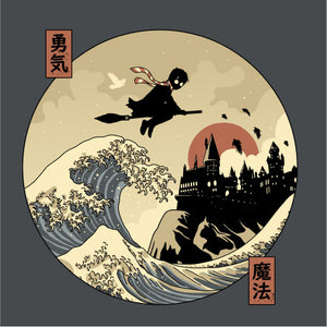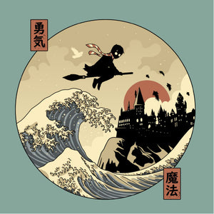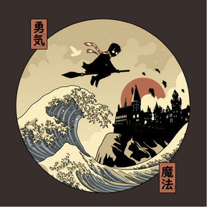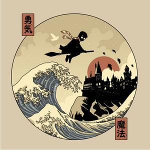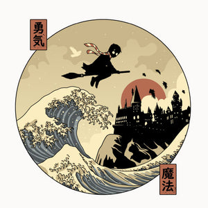 Découvrez une fusion magique entre le monde des sorciers et l’art iconique japonais ! Harry Potter survole la légendaire Vague de Kanagawa sur son Nimbus 2001, dans un style cartoon aux couleurs chaudes. En arrière-plan, le château de Poudlard se dresse majestueusement, ajoutant une touche féerique à cette illustration unique. Parfait pour les fans de l'univers d'Harry Potter et des œuvres artistiques originales, ce design mêle aventure et esthétisme. Disponible sur t-shirts, sweats et tote bags, il transporte votre style dans un monde où magie et art se rencontrent.