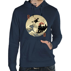 Découvrez une fusion magique entre le monde des sorciers et l’art iconique japonais ! Harry Potter survole la légendaire Vague de Kanagawa sur son Nimbus 2001, dans un style cartoon aux couleurs chaudes. En arrière-plan, le château de Poudlard se dresse majestueusement, ajoutant une touche féerique à cette illustration unique. Parfait pour les fans de l'univers d'Harry Potter et des œuvres artistiques originales, ce design mêle aventure et esthétisme. Disponible sur t-shirts, sweats et tote bags, il transporte votre style dans un monde où magie et art se rencontrent.