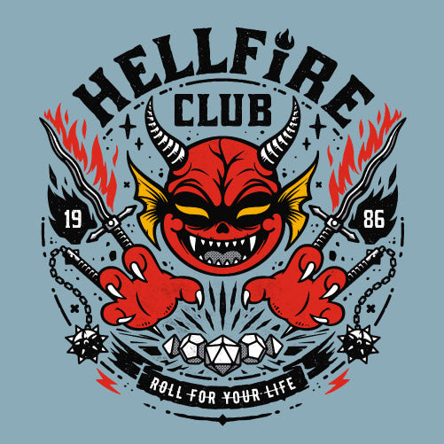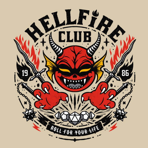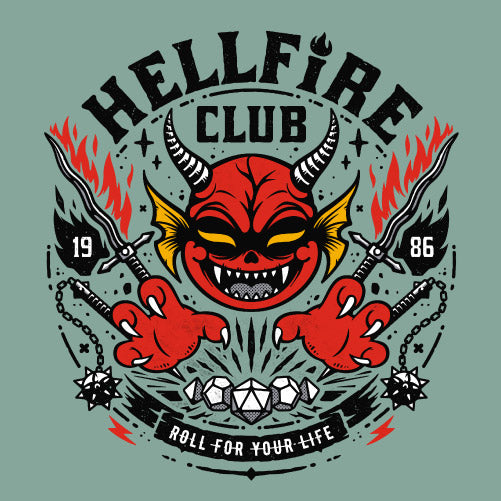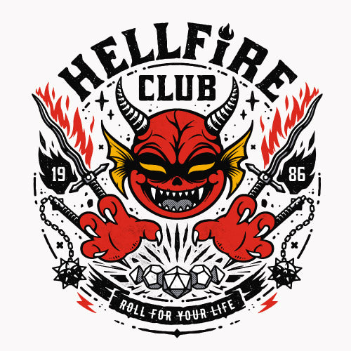Hell Fire Club rend hommage au club mythique de Stranger Things à travers une illustration au style cartoon, dynamique et nerveux. Le visuel intègre la phrase culte “Roll for your life”, véritable mantra des joueurs plongés dans des parties où tout peut basculer sur un lancer de dés. Autour, on retrouve les éléments emblématiques du jeu de rôle : dés polyédriques, armes fantasy dominés par une tête de diable arborant un sourire malicieux. L’ensemble dégage une énergie fun, sombre et rebelle, parfaite pour les fans de pop culture, de RPG et de l’univers Stranger Things.