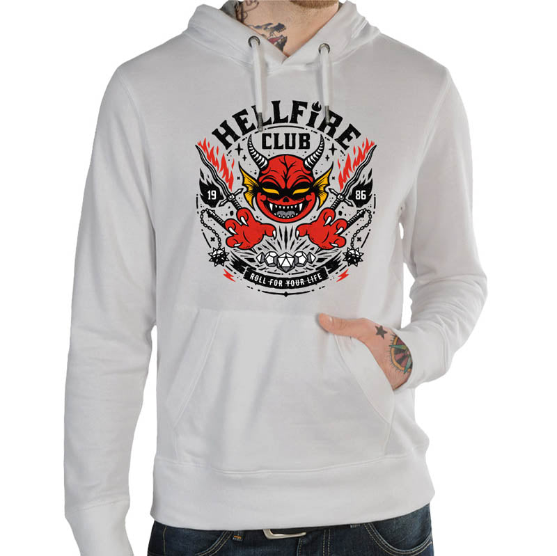 Hell Fire Club rend hommage au club mythique de Stranger Things à travers une illustration au style cartoon, dynamique et nerveux. Le visuel intègre la phrase culte “Roll for your life”, véritable mantra des joueurs plongés dans des parties où tout peut basculer sur un lancer de dés. Autour, on retrouve les éléments emblématiques du jeu de rôle : dés polyédriques, armes fantasy dominés par une tête de diable arborant un sourire malicieux. L’ensemble dégage une énergie fun, sombre et rebelle, parfaite pour les fans de pop culture, de RPG et de l’univers Stranger Things.