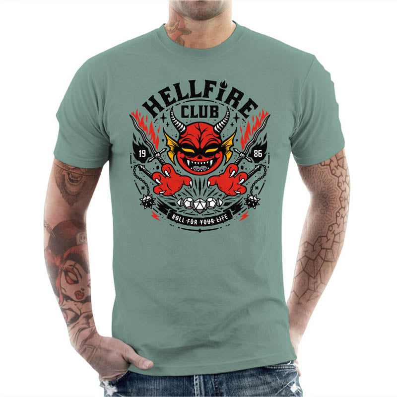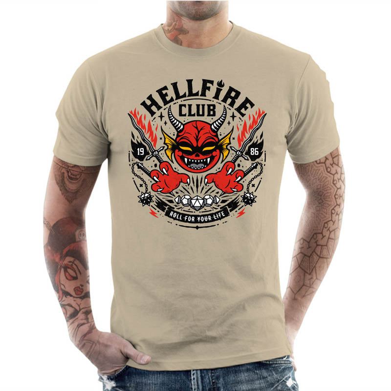 Hell Fire Club rend hommage au club mythique de Stranger Things à travers une illustration au style cartoon, dynamique et nerveux. Le visuel intègre la phrase culte “Roll for your life”, véritable mantra des joueurs plongés dans des parties où tout peut basculer sur un lancer de dés. Autour, on retrouve les éléments emblématiques du jeu de rôle : dés polyédriques, armes fantasy dominés par une tête de diable arborant un sourire malicieux. L’ensemble dégage une énergie fun, sombre et rebelle, parfaite pour les fans de pop culture, de RPG et de l’univers Stranger Things.