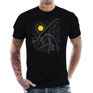 Le t-shirt "Impressionist Swordsman" capture l’essence de Guts, héros de la série Berserk, dans une représentation unique et poétique. Recouvert de son armure noire, Guts se tient dans une posture presque animale, portant sur son épaule son épée immense. Le design s’inspire de l’impressionnisme, rappelant l’ambiance de La Nuit étoilée, mais avec des traits plus fins et un style moins chargé. Ce t-shirt allie la force brute du guerrier à la beauté subtile de la peinture impressionniste, créant un contraste fascinant et captivant pour les fans de Berserk et d’art