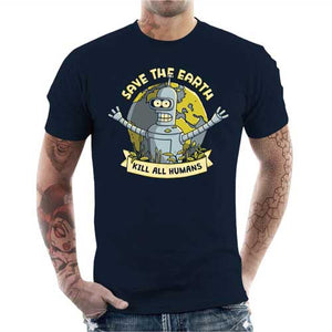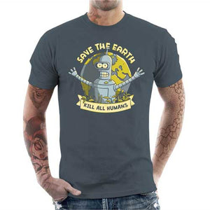Lorsque vous confiez au très cynique Bender Tordeur Rodríguez la mission de trouver une solution pour sauver la planète, ne vous attendez pas à un lâcher de licornes ou un message de paix universel. L’irrésistible robot de Futurama ne fait pas dans la dentelle, mais c’est aussi pour ça qu’on l’aime ! Avec ce tee-shirt hilarant qui allie sensibilisation environnementale et humour noir, vous allez faire un tabac !