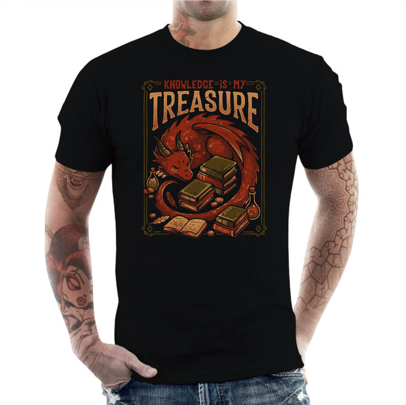 Knowledge met en scène un dragon majestueux, lové en cercle autour de son trésor le plus précieux : des livres. Au cœur de son corps protecteur repose une pile d’ouvrages, symbolisant la connaissance comme richesse ultime. La phrase “Knowledge is my treasure” renforce cette idée : la véritable puissance ne réside pas dans l’or, mais dans le savoir. Cette illustration s’adresse aux esprits curieux, aux lecteurs passionnés et à celles et ceux qui voient la culture comme une aventure infinie. Entre fantasy et poésie, le visuel célèbre l’amour de la lecture et la quête permanente de connaissances.