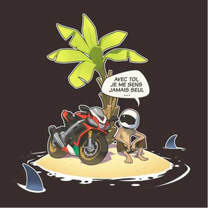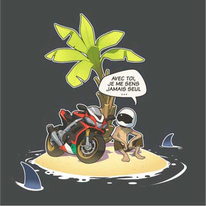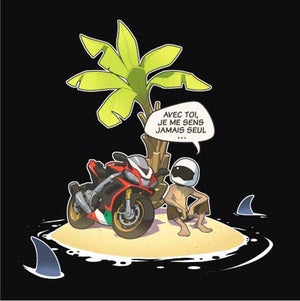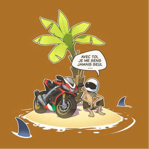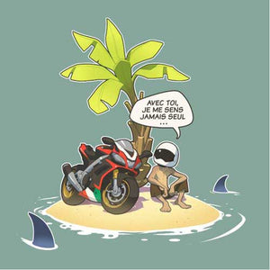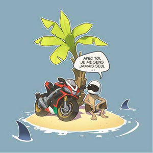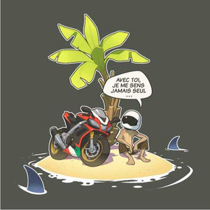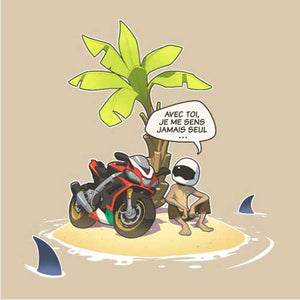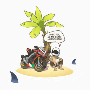 Vous connaissez tous cette grande question, à laquelle il n’est pas toujours évident de répondre. Que choisiriez-vous si vous ne deviez emporter qu’un seul objet sur une île déserte ? Là où le commun des mortels serait toujours en train de cogiter, le motard, lui, n’a aucune hésitation : sa moto ! Avec elle, il ne se sent jamais seul. Nul doute que le malheureux naufragé lui donnera même un non, histoire de rendre les conversations plus sympas.