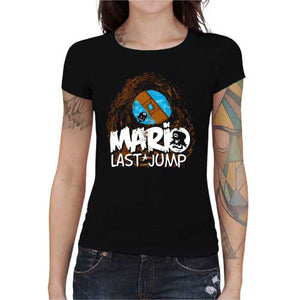 Véritable icône du jeu vidéo, Mario est naturellement au cœur de notre collection de tee-shirts gamer ! Ce plombier bondissant, reconverti sauveur de princesses, s’est fait le spécialiste de franchir tous les obstacles. Mais aucun joueur n’est infaillible, et pour l’infortuné héros ratant une plateforme, c’est une vie de perdue, jusqu’à l’inéluctable game over. Une issue fatale qu’on a voulu représenter avec humour sur ce t-shirt ! Pour Mario, c’était bel et bien le last jump… On notera le visage inquiet de Luigi, qui va visiblement devoir s’y coller pour aller mettre une rouste à Bowser.