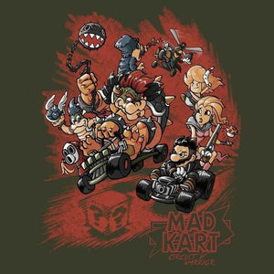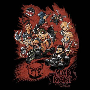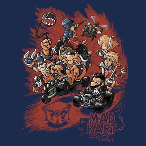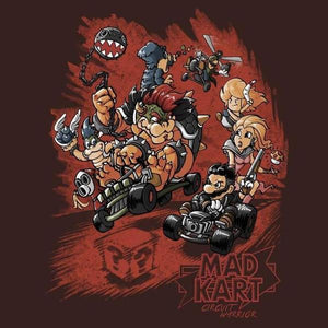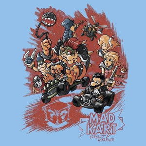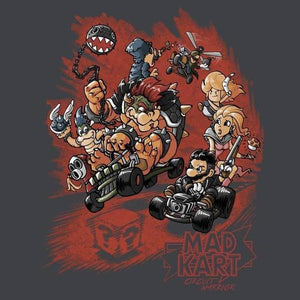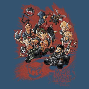 La saga Mario Kart et le film Mad Max 2, dont Fury Road reprend l’esprit, partagent comme point commun d’être des courses de véhicules totalement folles ! Des joutes où tous les coups sont permis, à l’action frénétique. Cela nous a donné l’idée de ce t-shirt Mad Kart bien barré, qui va vous valoir un beau succès auprès de vos amis fans de jeux vidéo et de ciné !