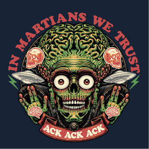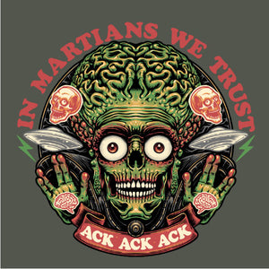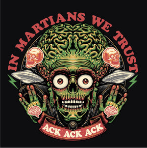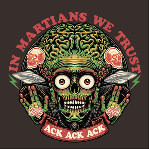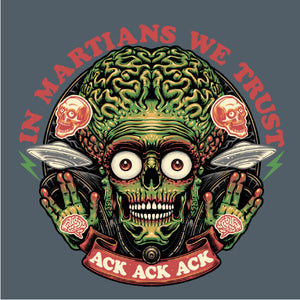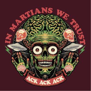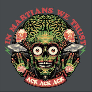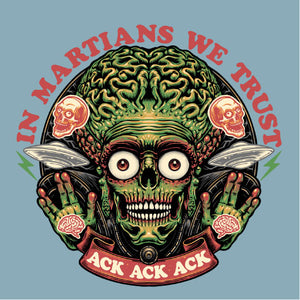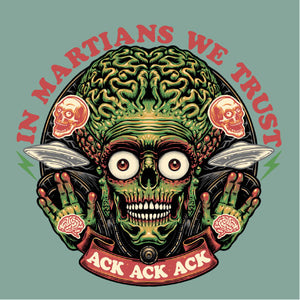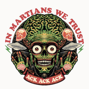 Retrouvez le terrifiant et hilarant Martien de Mars Attacks! dans une illustration pleine d’humour noir. Avec sa célèbre réplique "Ack Ack Ack" et la phrase ironique "In Martians We Trust", ce design capture l’essence absurde et satirique du film culte. Les détails graphiques accentuent son allure menaçante tout en rendant hommage à l’univers kitsch et rétro de cette œuvre iconique. Parfait pour les fans de science-fiction et d’humour décalé, ce visuel est disponible sur t-shirts, sweats et tote bags. Affirmez votre style tout en célébrant ce classique extraterrestre unique en son genre.