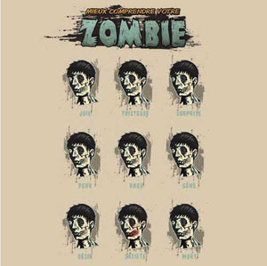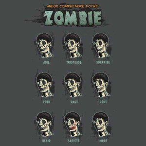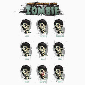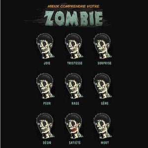 Surprise, tristesse, peur, joie… On ne dirait pas comme ça, mais dans son quotidien, un zombie passe par toute une palette d’émotions et de sentiments ! Checkpoint vous propose d’apprendre à les décoder, histoire de parer à toute éventualité en cas d’invasion ! Un tee-shirt humoristique et délicieusement geek pour tous les amateurs de zombies !