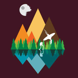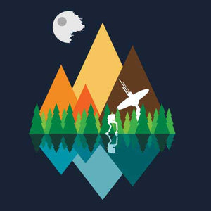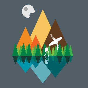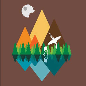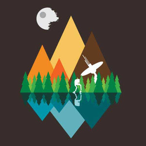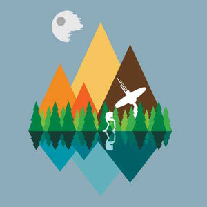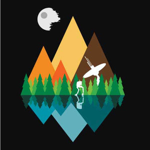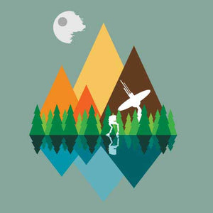 Voilà un t-shirt parodie de Star Wars qui plaira aux amateurs d’illustrations stylisées et minimalistes. Plutôt décrié à l’époque de sa sortie, Le Retour du Jedi n’en reste pas moins un épisode culte de la saga de George Lucas. Le duel contre Jabba, la course-poursuite en motojet, ou bien encore le duel final contre Dark Vador et l’Empereur resteront à jamais inoubliables ! Sur ce tee-shirt, c’est à la très belle planète Endor qu’on a choisi de rendre hommage. On reconnaîtra au passage le générateur de protection, l’Etoile de la Mort, et un AT-ST probablement sur le point de se faire exploser par ces chers Ewoks.