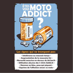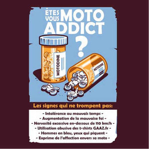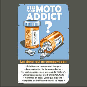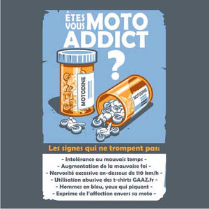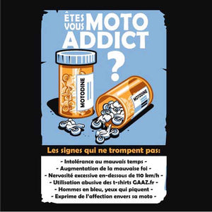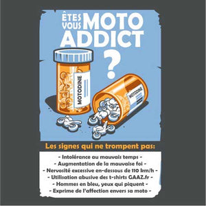 Vous avez peur d’être un moto addict ? Si vous souffrez d’un ou plusieurs des symptômes suivants, pas de panique, on a deux remèdes possibles. La prise de Motodine deux fois par jour jusqu’à ce que les effets de manque s’estompent. Ou bien vous filez rejoindre votre moto d'amour, pour une cure de 50 km par jour pendant 3 semaines. Dans un cas comme dans l’autre, vous vous en doutez, il vous sera difficile de décrocher !