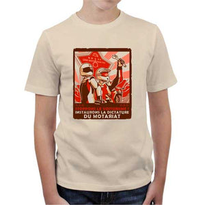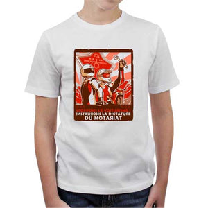 "Stoppons le voiturisme et imposons la dictature du motoriat !!". Un slogan détournant le bien connu : "Stoppons le capitalisme et instaurons la dictature du prolétariat". Pour représenter au mieux le message, nous nous sommes inspirés des vieilles affiches de propagande Soviétiques, au parfum vintage. Une moto pour tous et tous avec l'esprit motard ! Un tee-shirt très esthétique et original pour faire triompher l’idéologie du motoriat. On vous garantit que vous allez faire des adeptes !